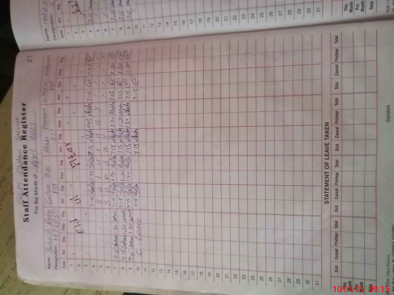 | CNIC | Full Name | Designation | R/C | Absence During Last Calender Month |