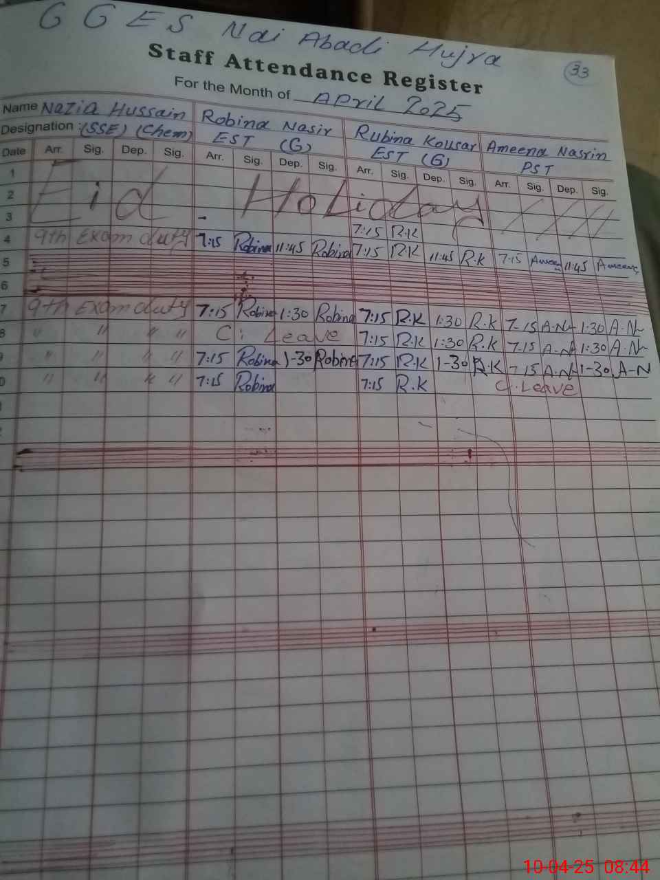 | CNIC | Full Name | Designation | R/C | Absence During Last Calender Month |