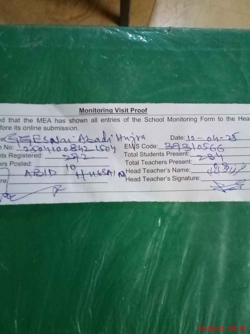 | Attendance Register | Head Teacher | MEA with School | Visit Proof |