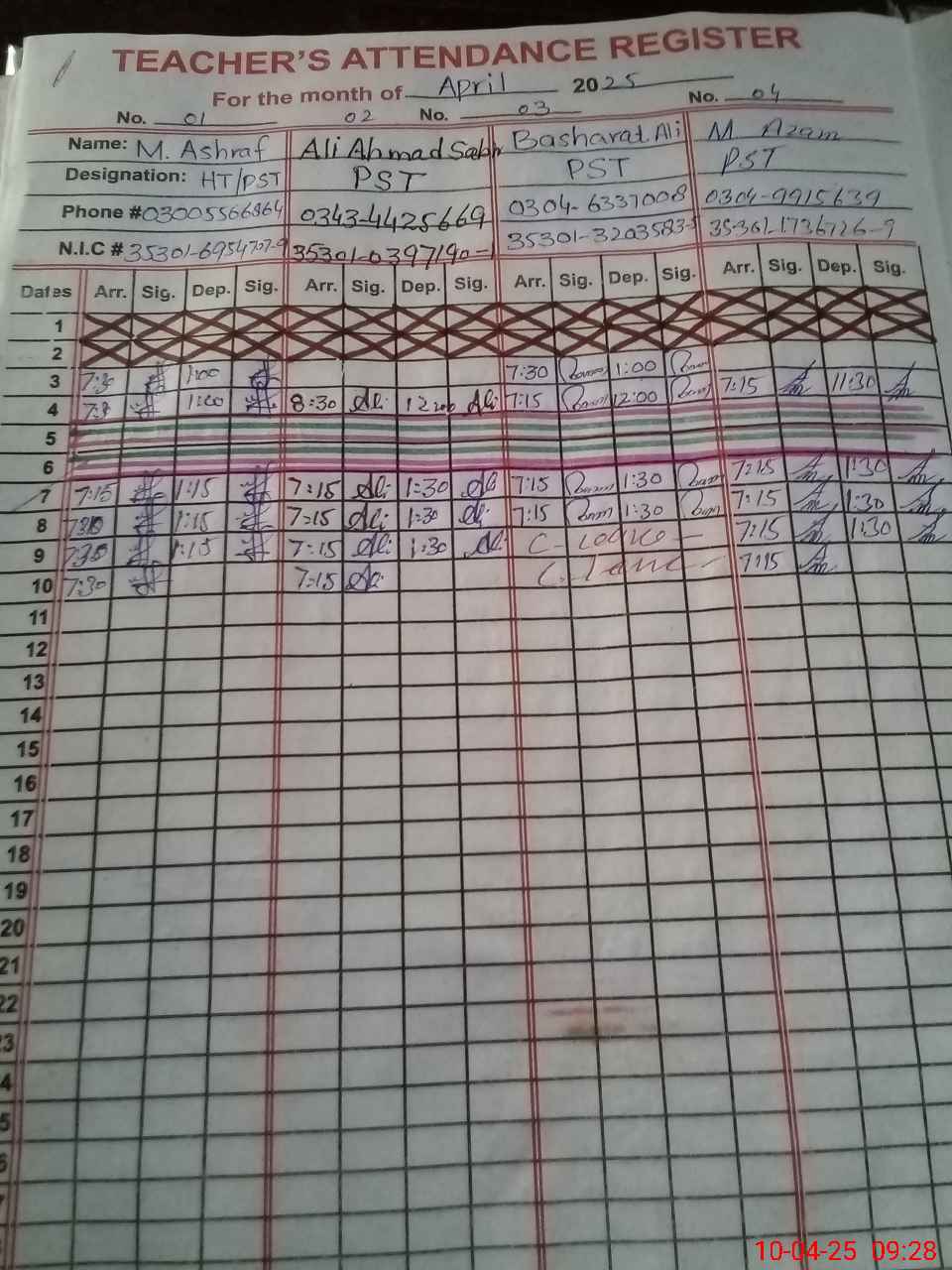| CNIC | Full Name | Designation | R/C | Absence during last cal. month |