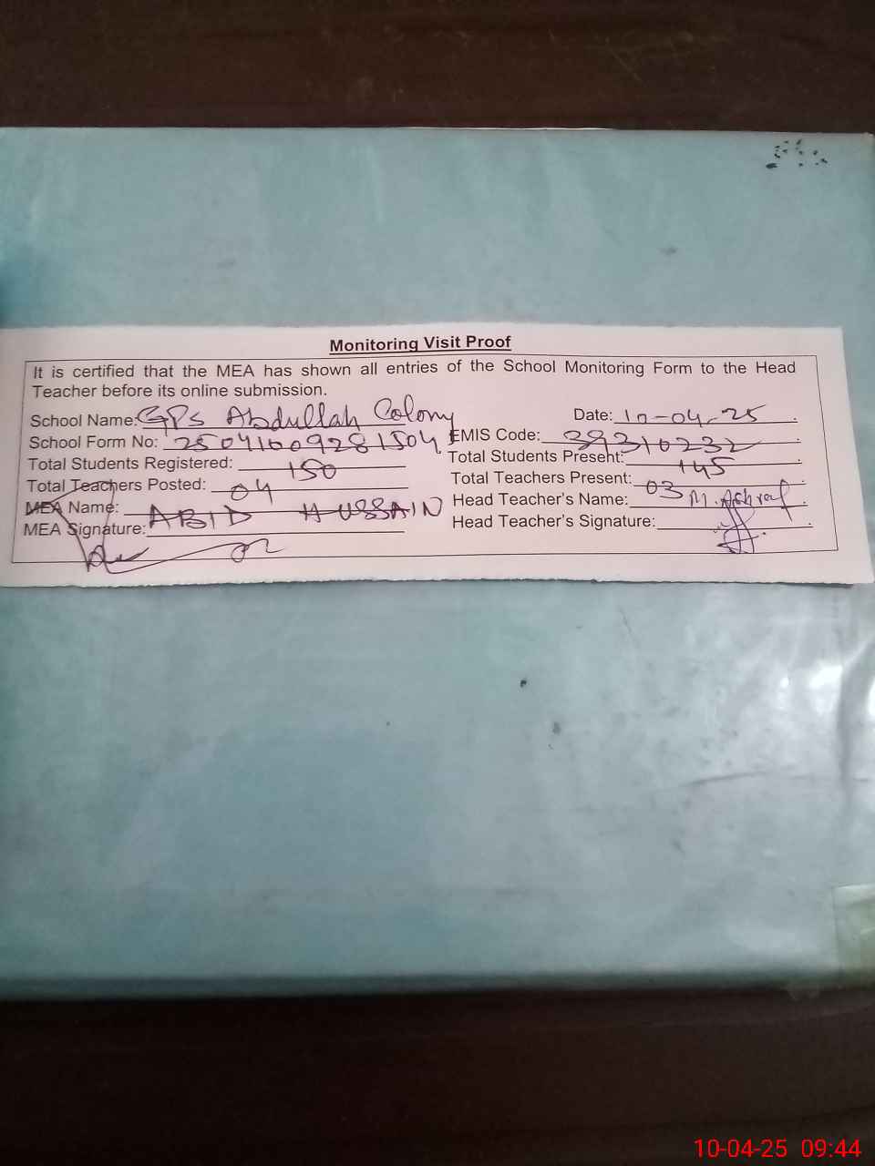 | Attendance Register | Head Teacher | MEA with School | Visit Proof |