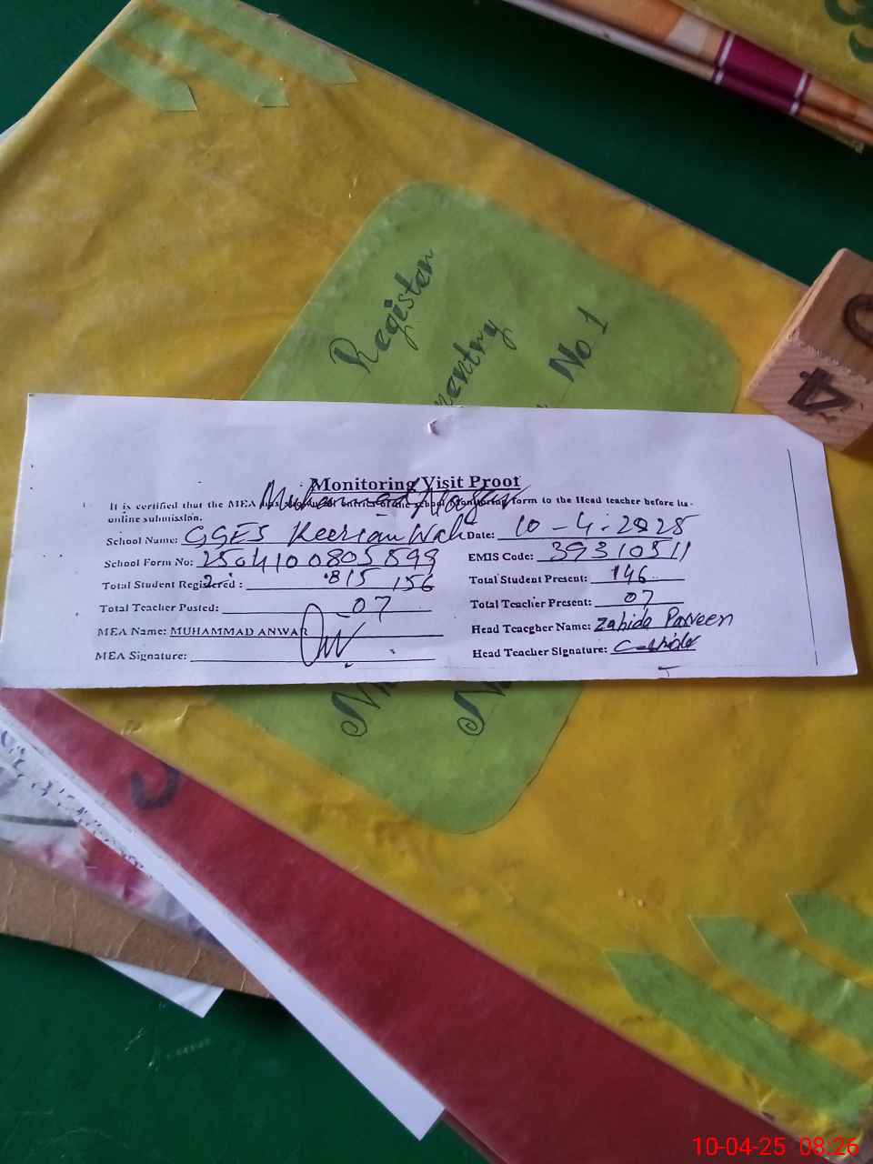 | Attendance Register | Head Teacher | MEA with School | Visit Proof |