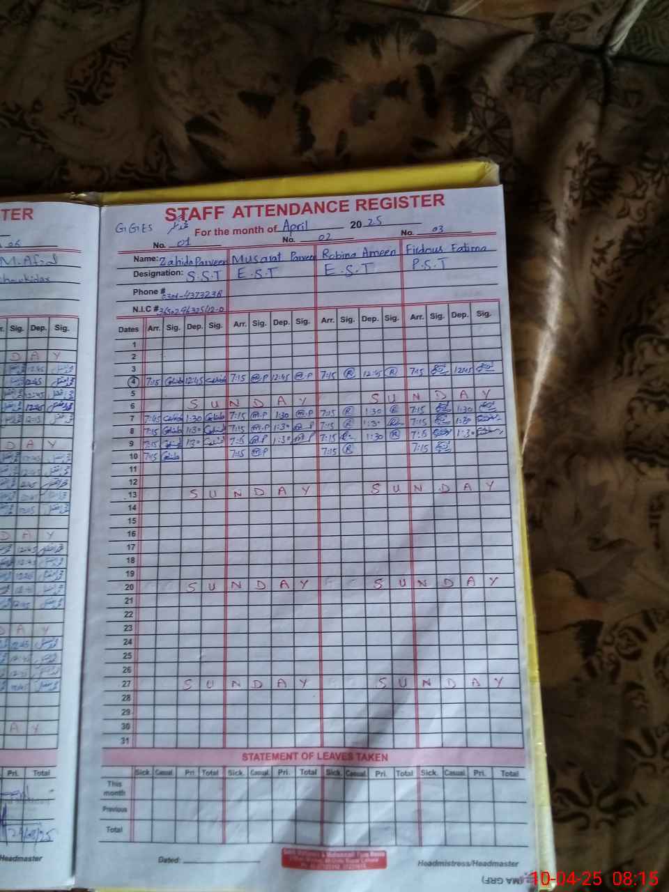 | Name: ZA**** PE**** Designation: (School Headmaster's/Headmistress's) SST Phone/Cell Number: 03**** |