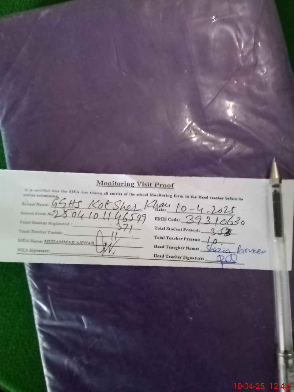 | Attendance Register | Head Teacher | MEA with School | Visit Proof |