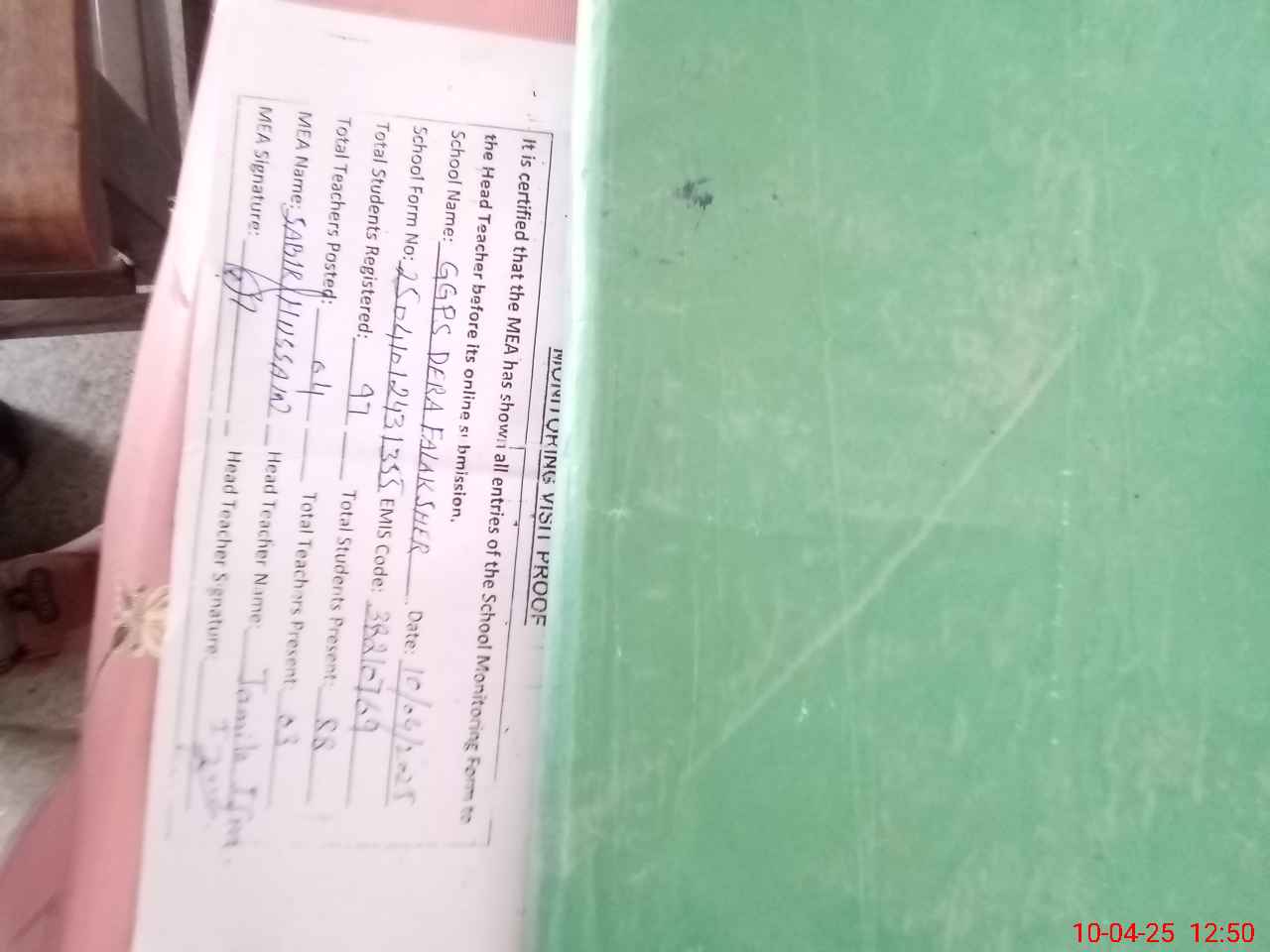 | Certified that this School was Inspected by the Undersigned MEA/DMO Today and the Information Stated Above is as Per Record. | |||||