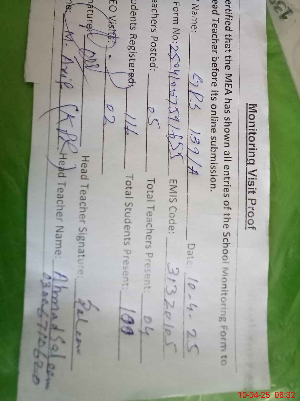 | Name: AH**** SA**** Designation: (School Headmaster's/Headmistress's) EST (GENERAL) Phone/Cell Number: 03**** |