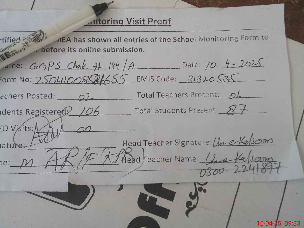 | Attendance Register | Head Teacher | MEA with School | Visit Proof |