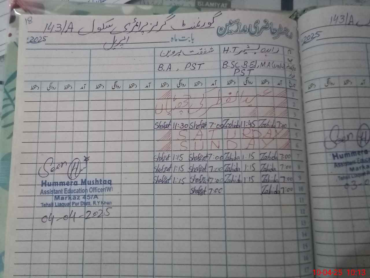 | District: RAHIMYAR KHAN | Tehsil: LIAQATPUR | Markaz: 45/A-FEMALE | Level: Primary | |