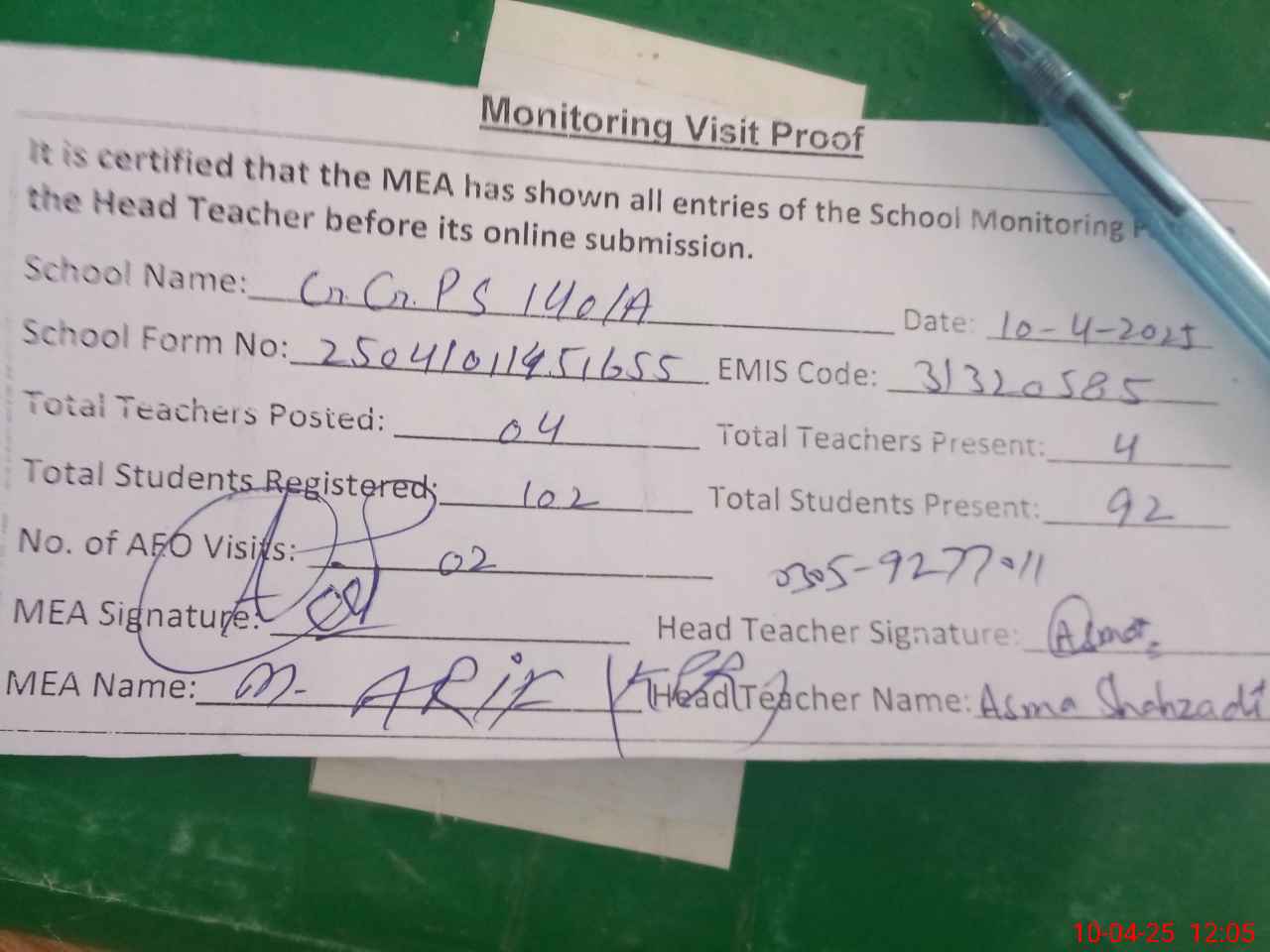 | Attendance Register | Head Teacher | MEA with School | Visit Proof |