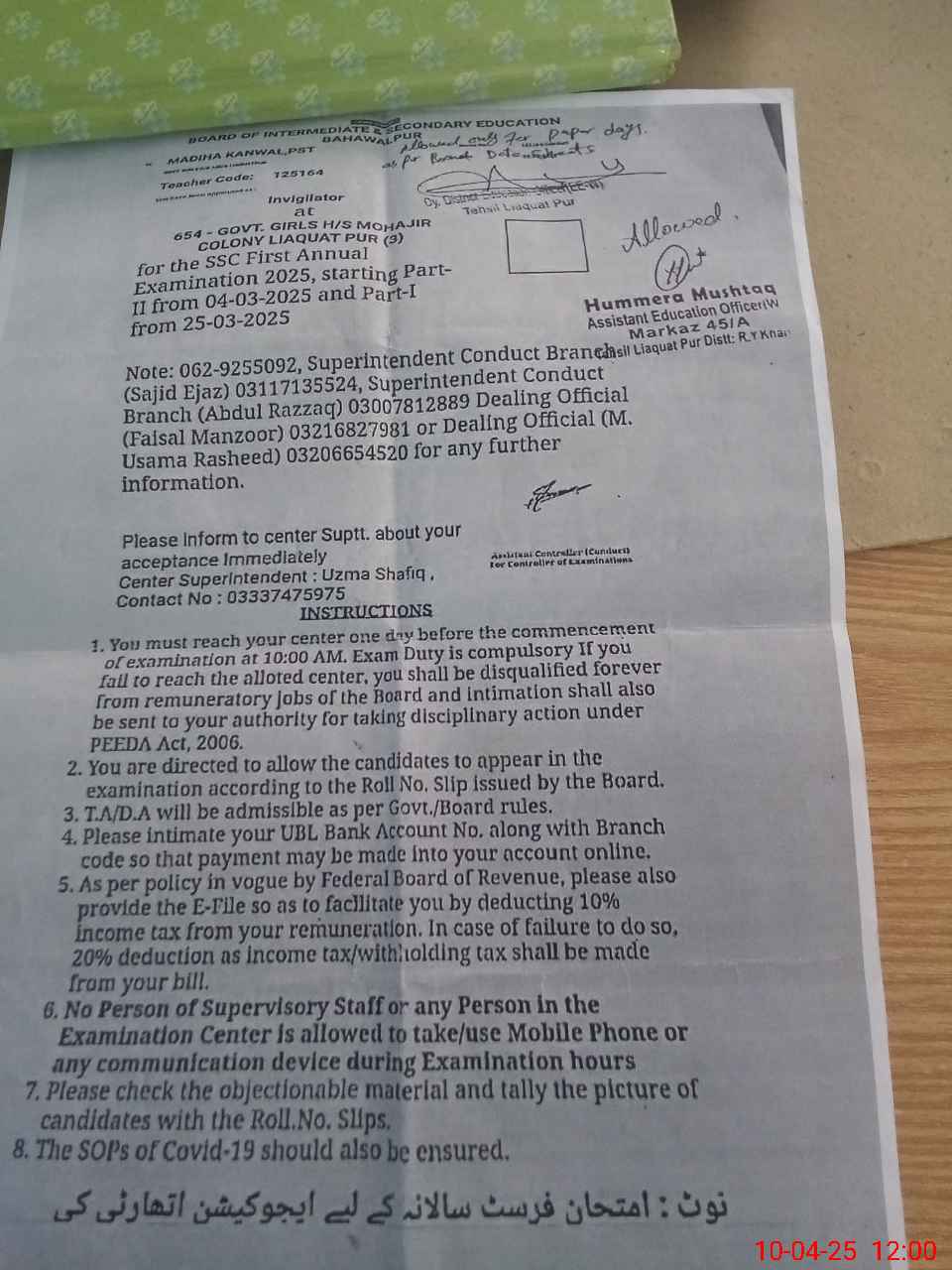 | Name: RA**** MA**** Designation: (School Headmaster's/Headmistress's) PST Phone/Cell Number: 03**** |