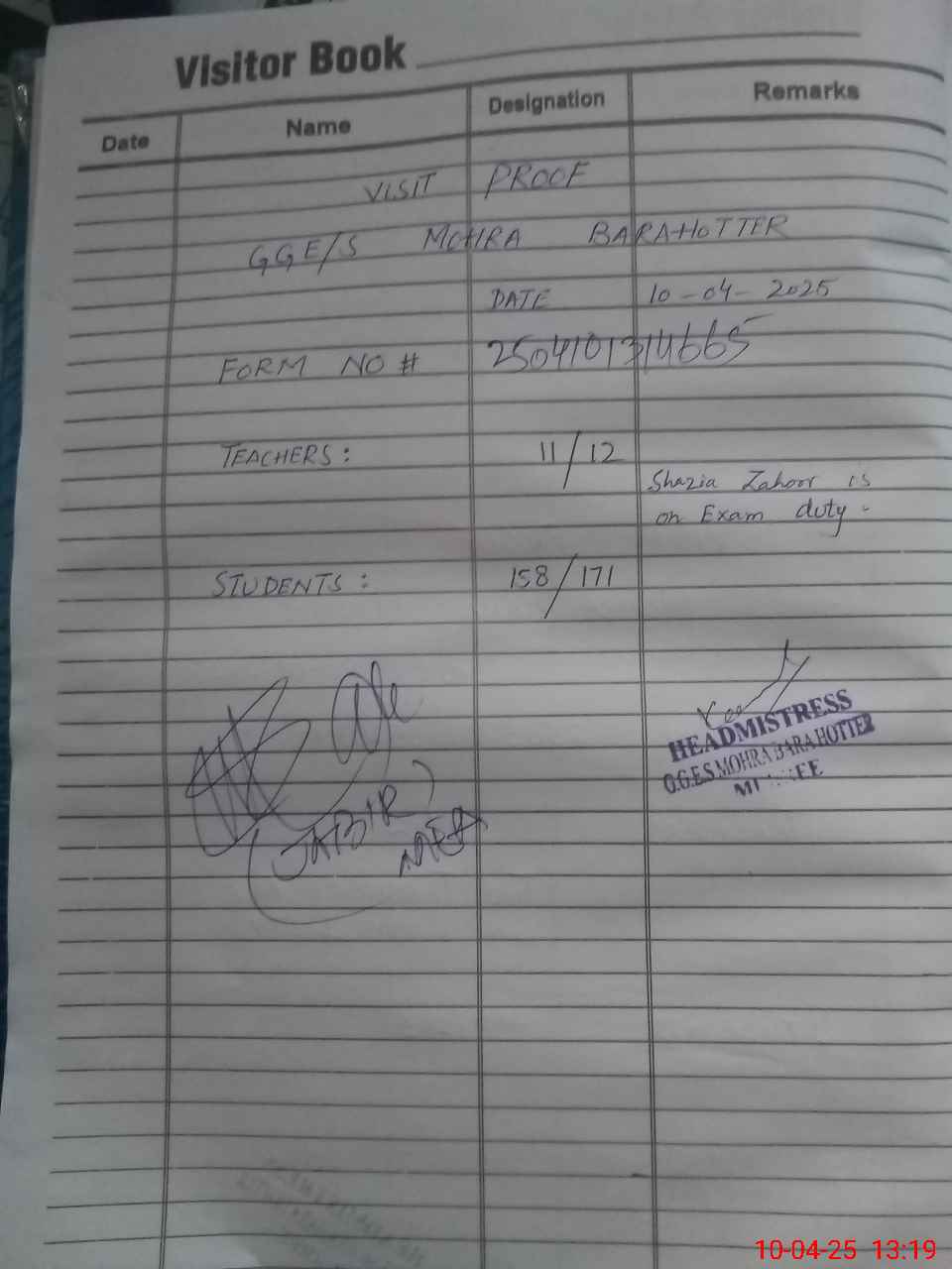 | Attendance Register | Head Teacher | MEA with School | Visit Proof |