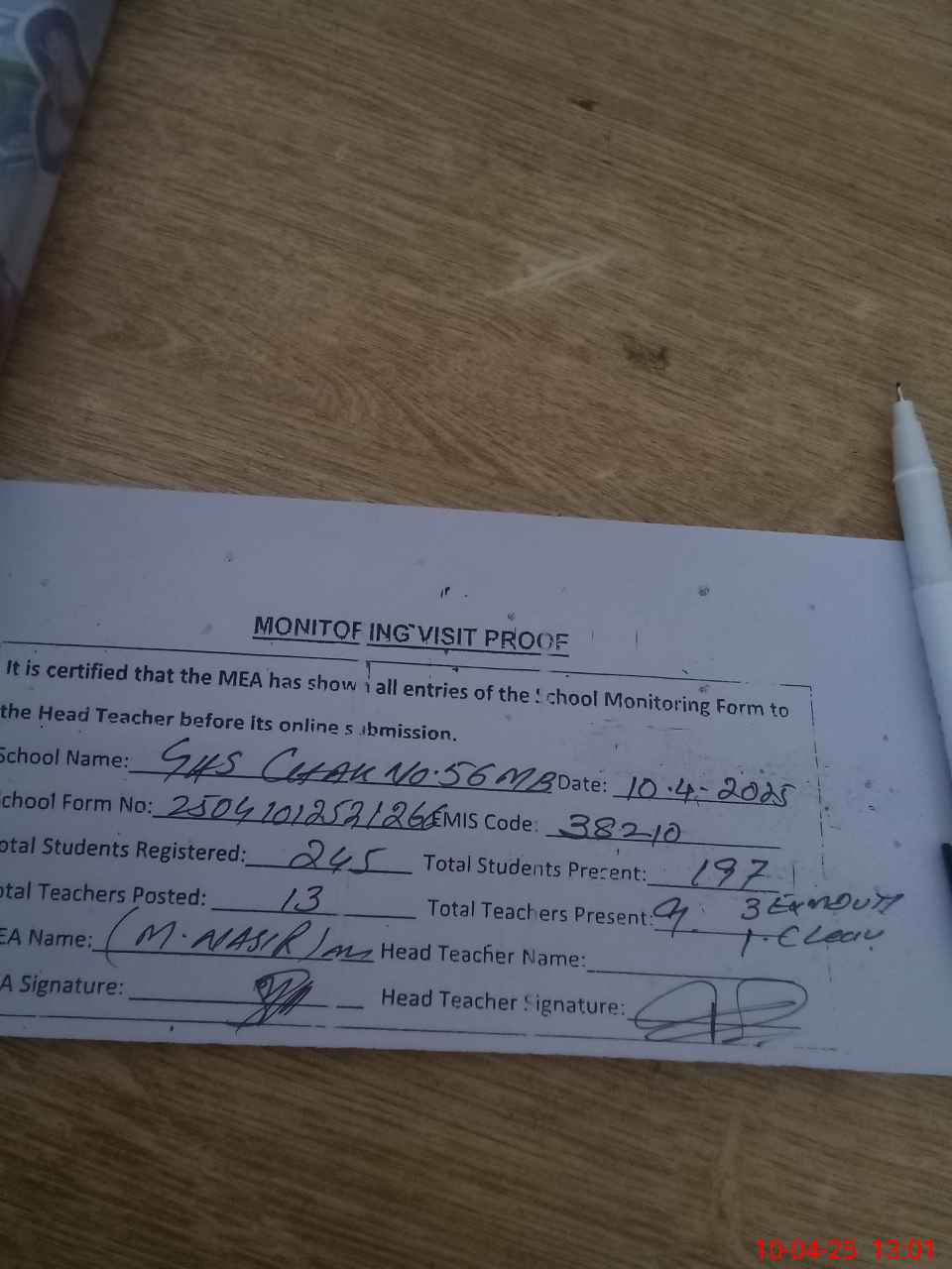 | Attendance Register | Head Teacher | MEA with School | Visit Proof |