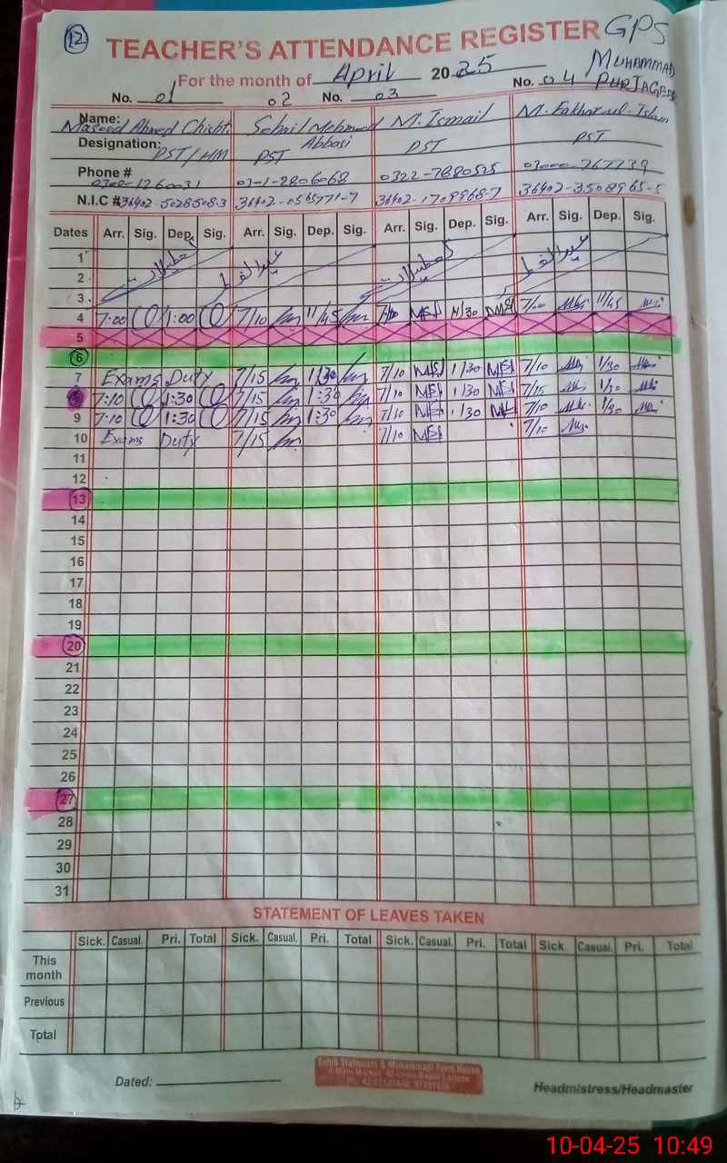 | 36**** | Ma**** Ah**** Ch**** | PST | Regular | 0 | 0 | 0 | 0 | 0 | 0 | 0 | 0 | 0 | Exam Duty |