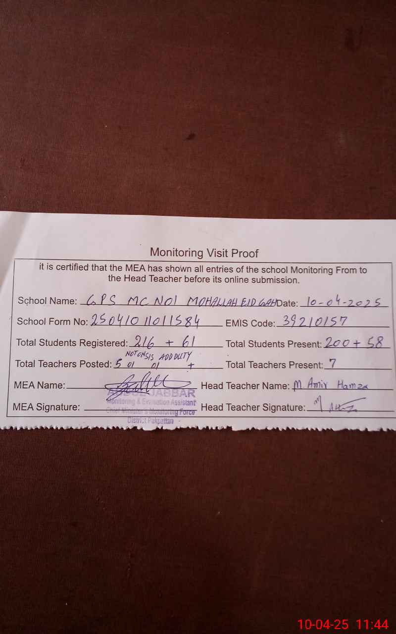 | EMIS Code: 39210157 | Name of School: GPS MC NO. 1 MOHALLAH EID GAH | |||