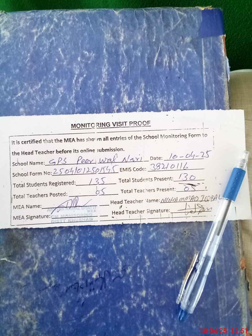 | Attendance Register | Head Teacher | MEA with School | Visit Proof |