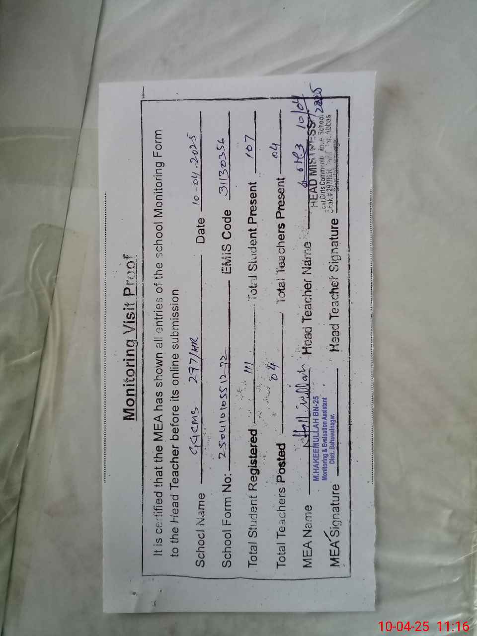 | Monitoring Date: 10-04-2025 | Start Time: 10-04-2025 10:55 AM | End Time: 10-04-2025 11:16 AM | Name of MEA: Mu**** ha**** ul**** BN25 | |