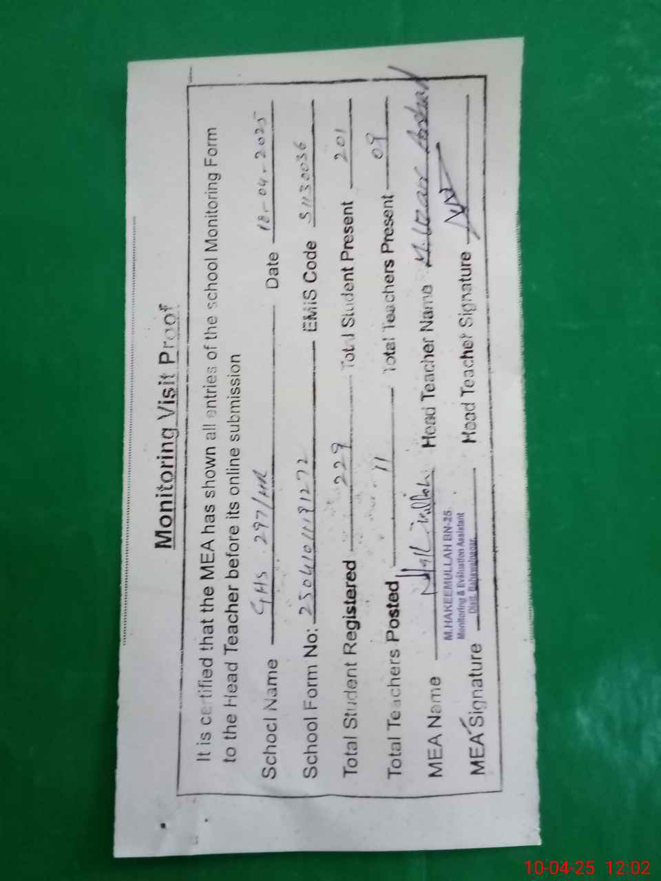 | EMIS Code: 31130036 | Name of School: GHS CHAK 297/HR | |||