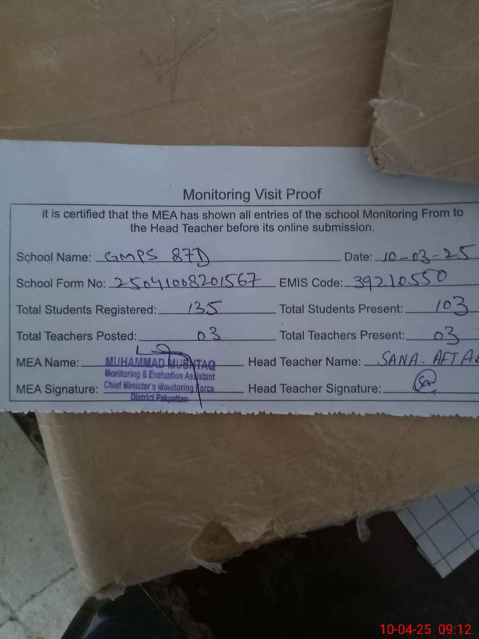 | Attendance Register | Head Teacher | MEA with School | Visit Proof |