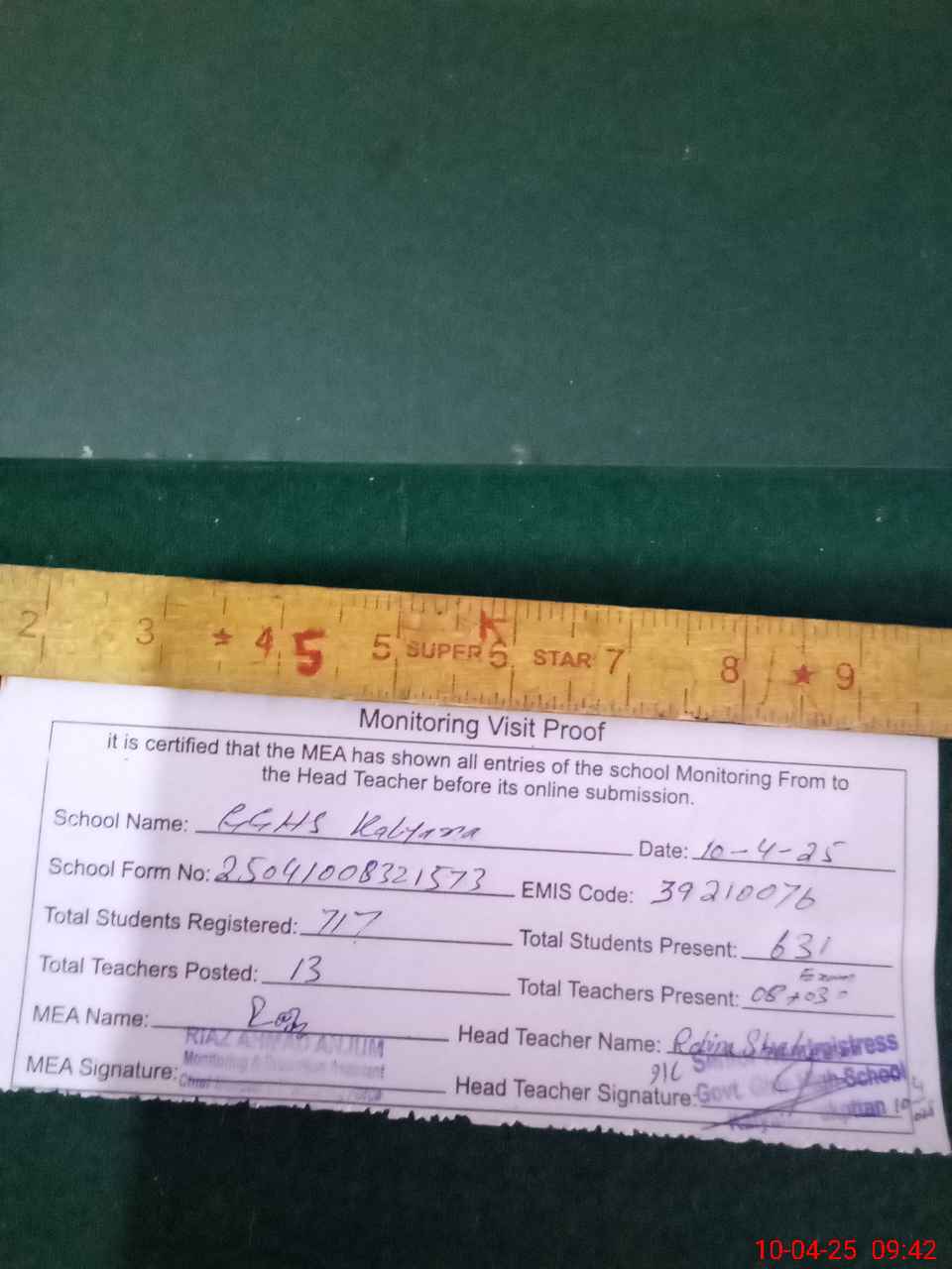 | Attendance Register | Head Teacher | MEA with School | Visit Proof |