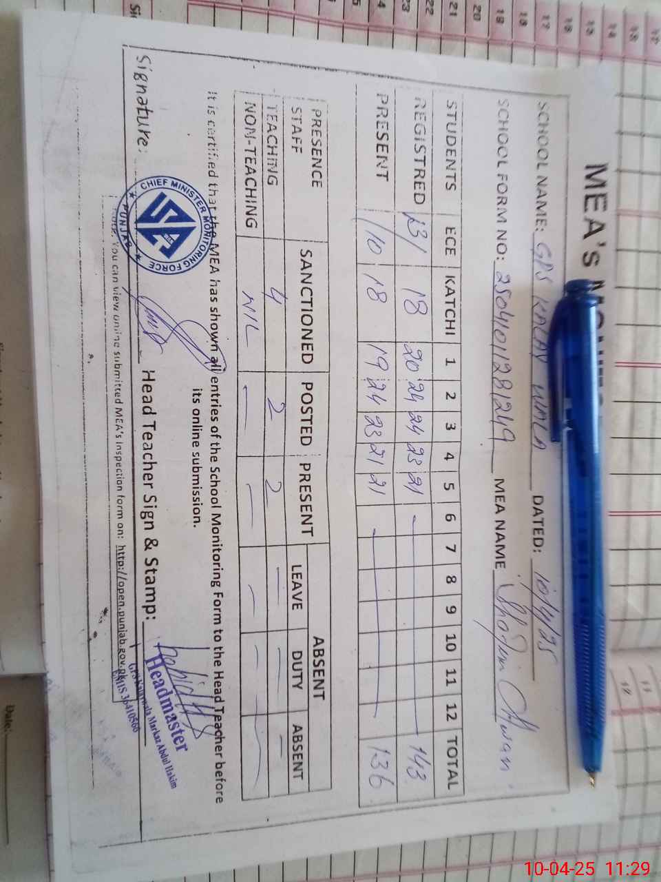 | Attendance Register | Head Teacher | MEA with School | Visit Proof |