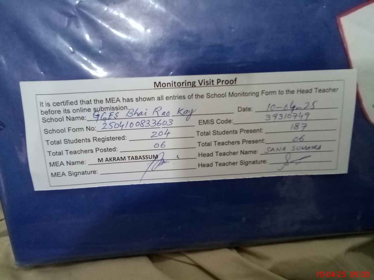 | Attendance Register | Head Teacher | MEA with School | Visit Proof |
