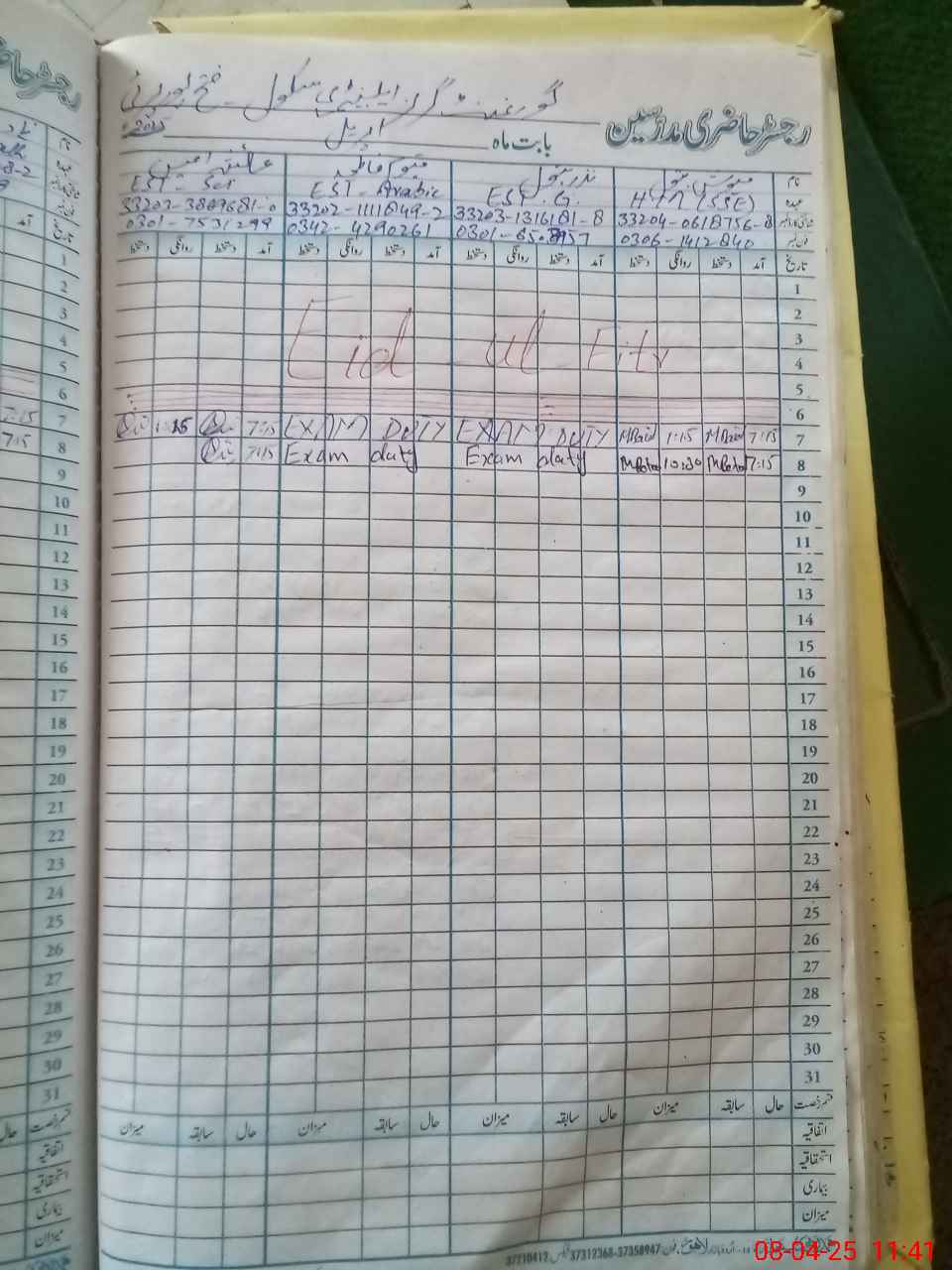 | 33**** | Na**** Ba**** | EST | Regular | 0 | 0 | 0 | 0 | 0 | 0 | 0 | 0 | 0 | Exam Duty |