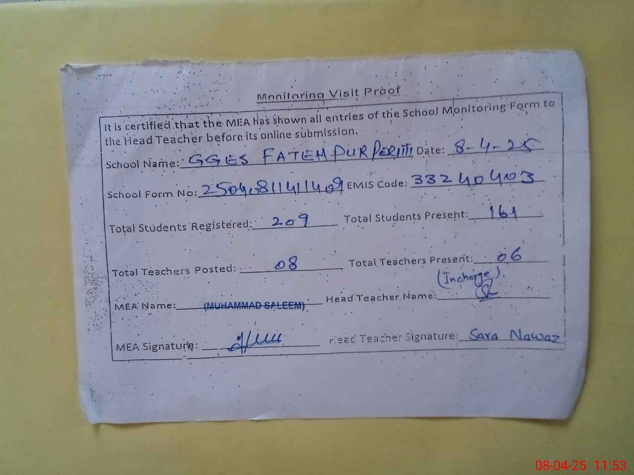 | Attendance Register | Head Teacher | MEA with School | Visit Proof |
