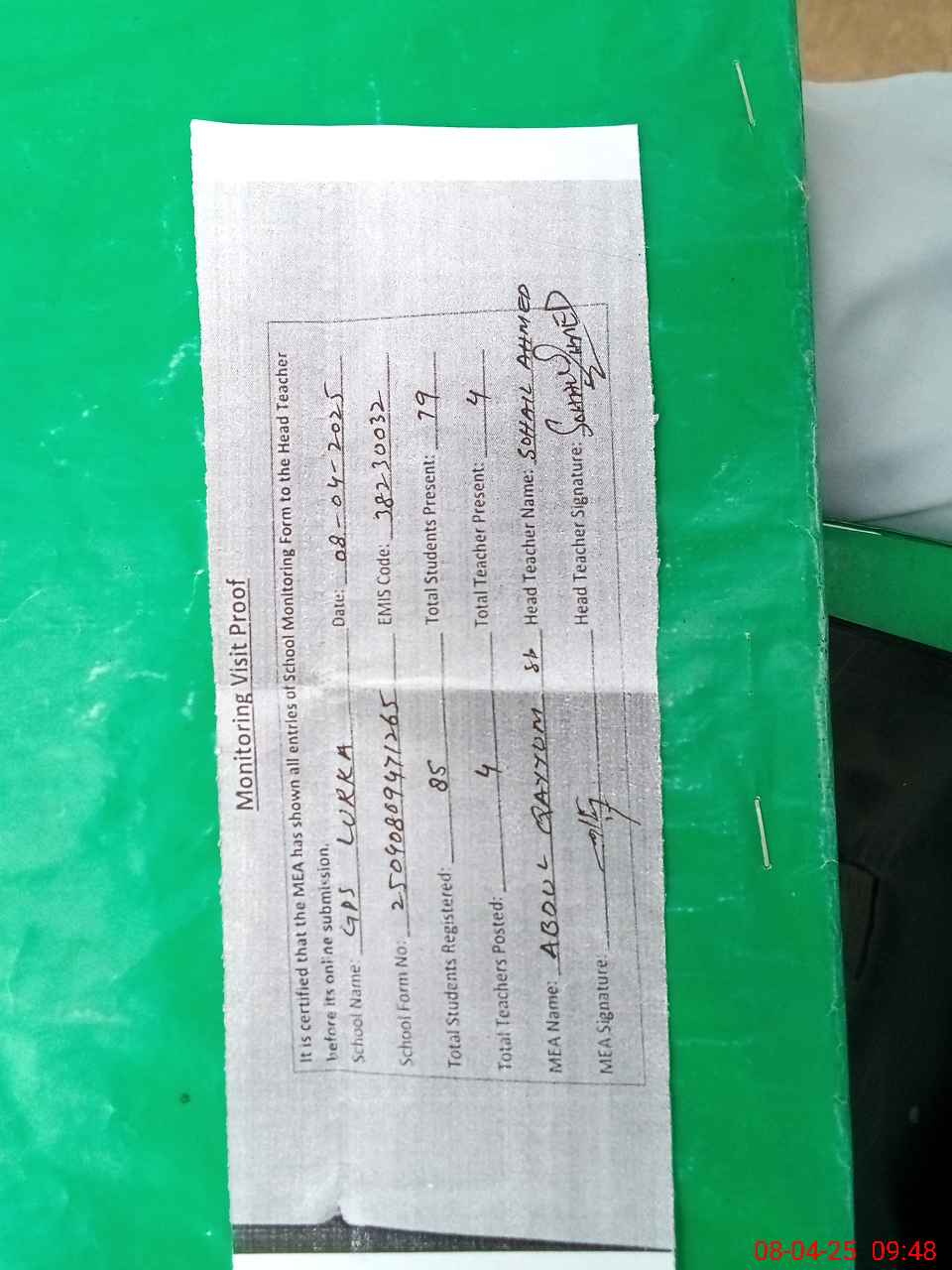 | Attendance Register | Head Teacher | MEA with School | Visit Proof |