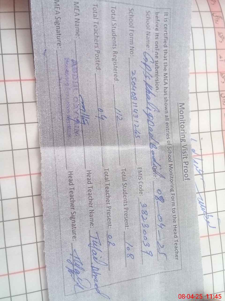 | Attendance Register | Head Teacher | MEA with School | Visit Proof |