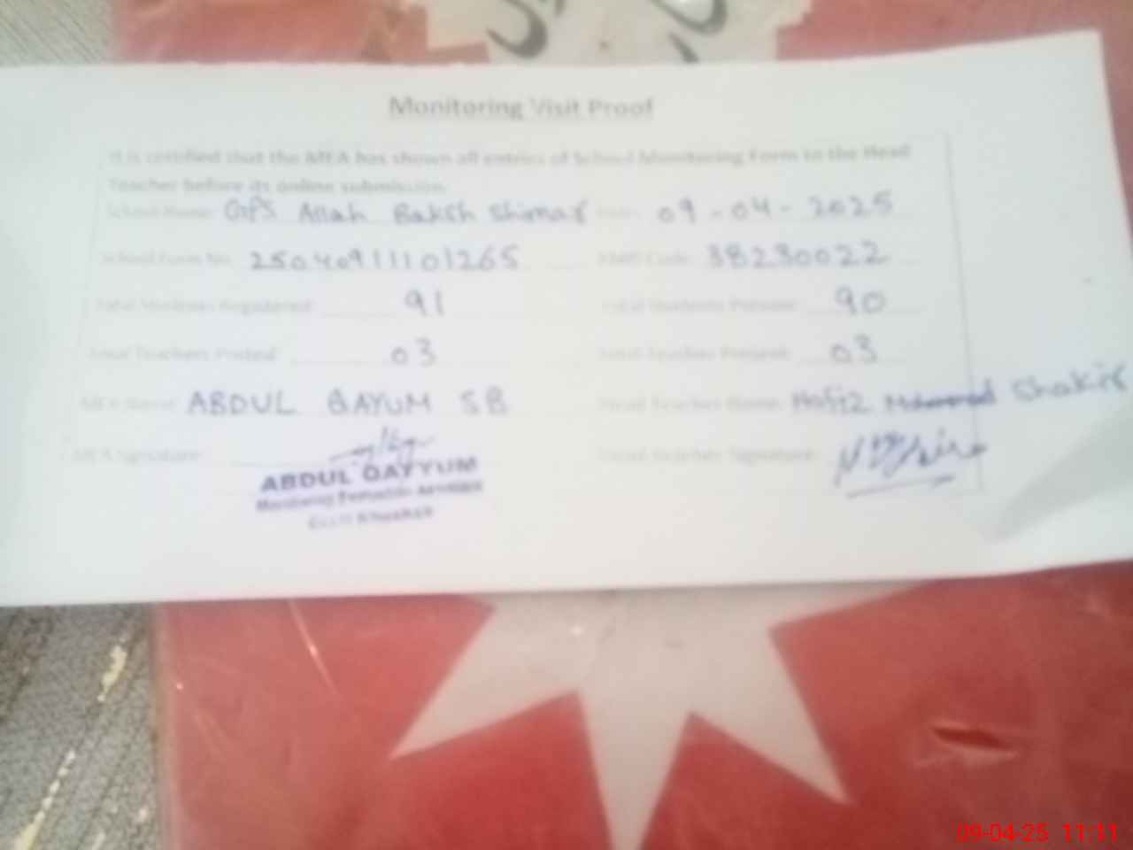 | Attendance Register | Head Teacher | MEA with School | Visit Proof |