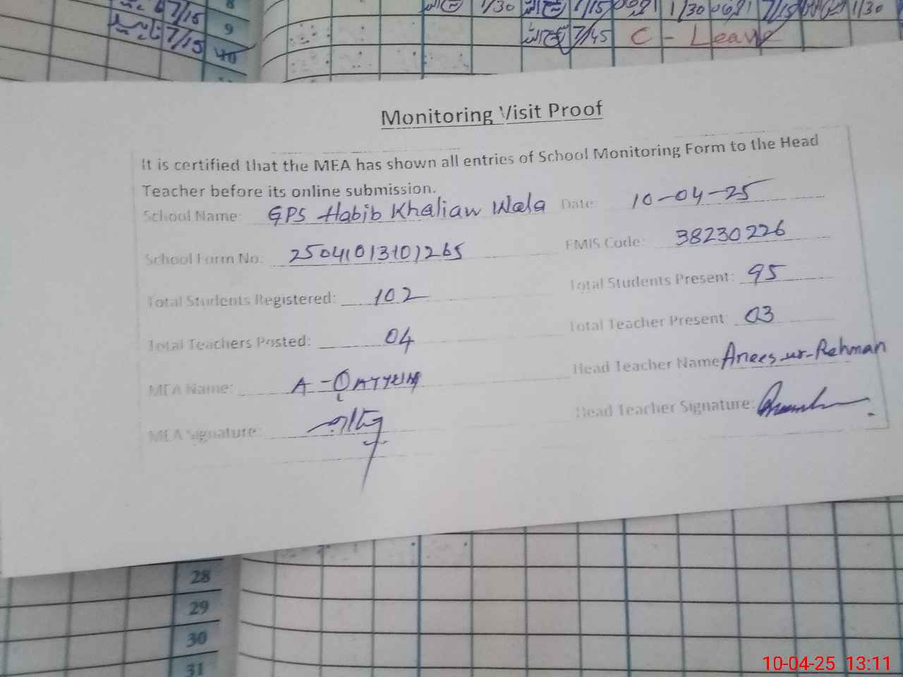 | Attendance Register | Head Teacher | MEA with School | Visit Proof |