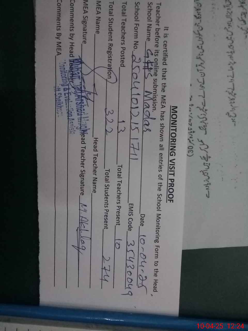 | Attendance Register | Head Teacher | MEA with School | Visit Proof |