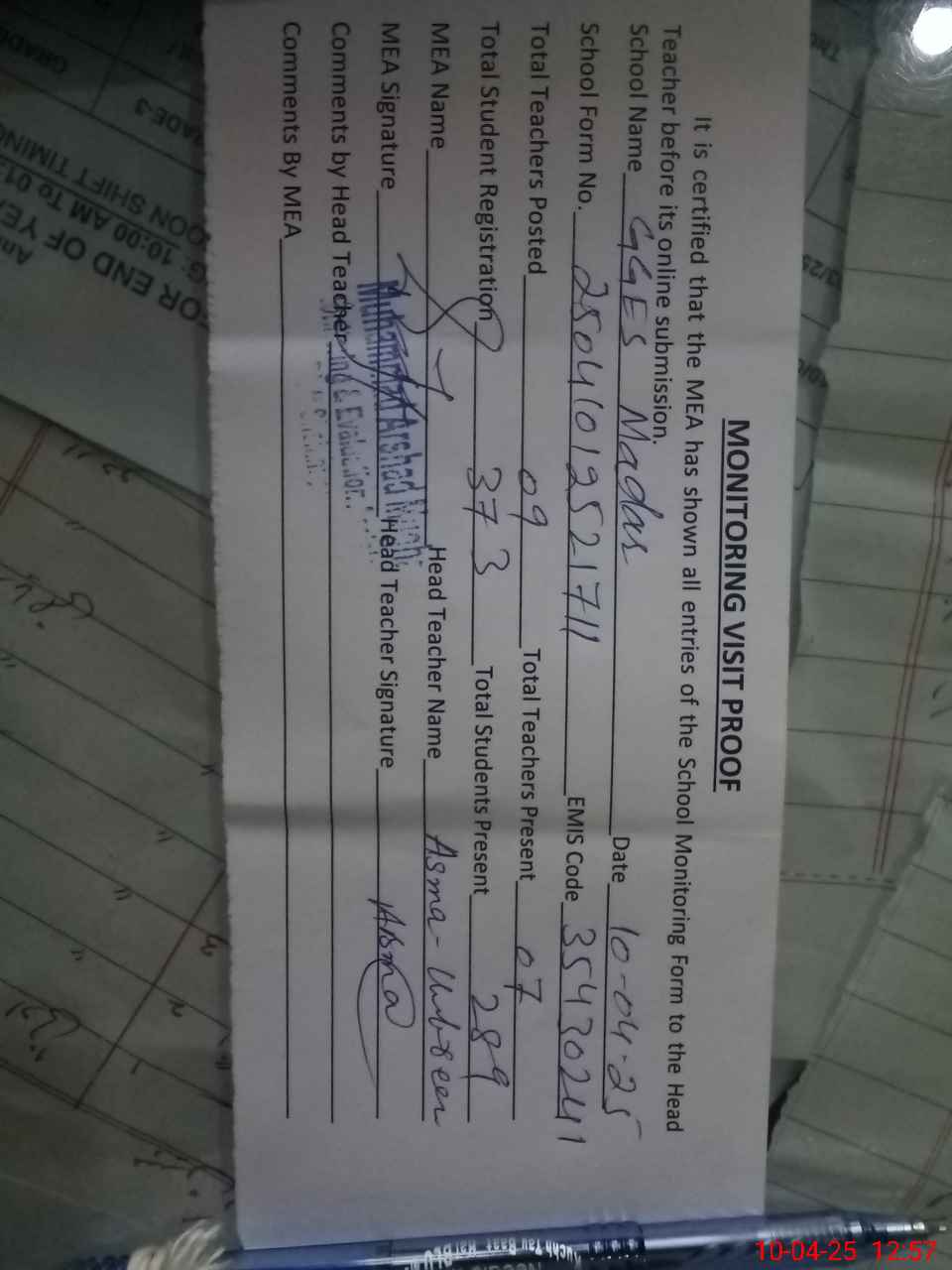| Certified that this School was Inspected by the Undersigned MEA/DMO Today and the Information Stated Above is as Per Record. | |||||