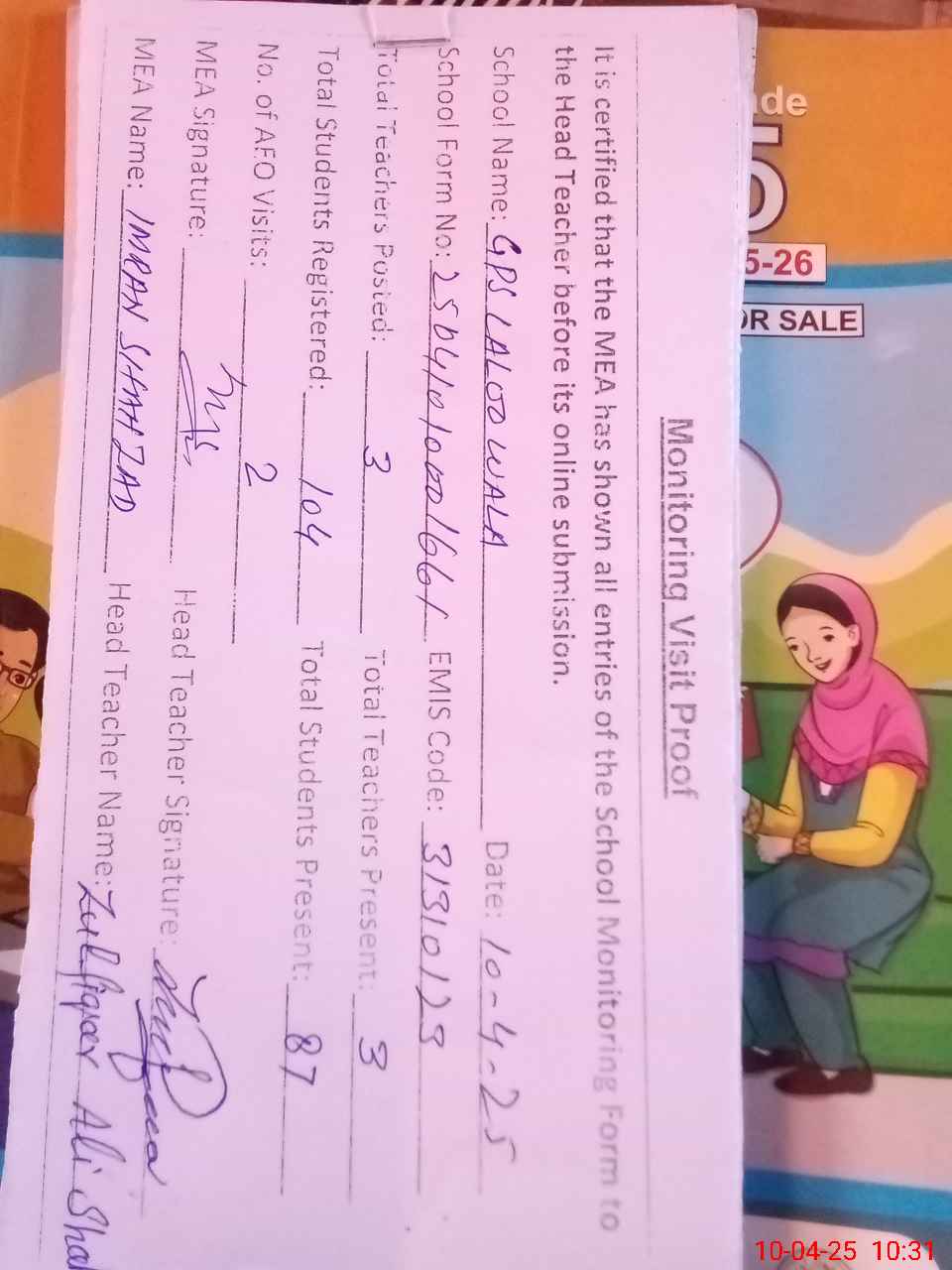 | Attendance Register | Head Teacher | MEA with School | Visit Proof |