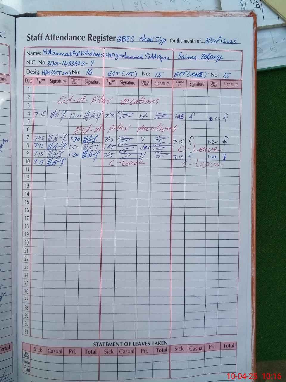 | CNIC | Full Name | Designation | R/C | Absence During Last Calender Month |