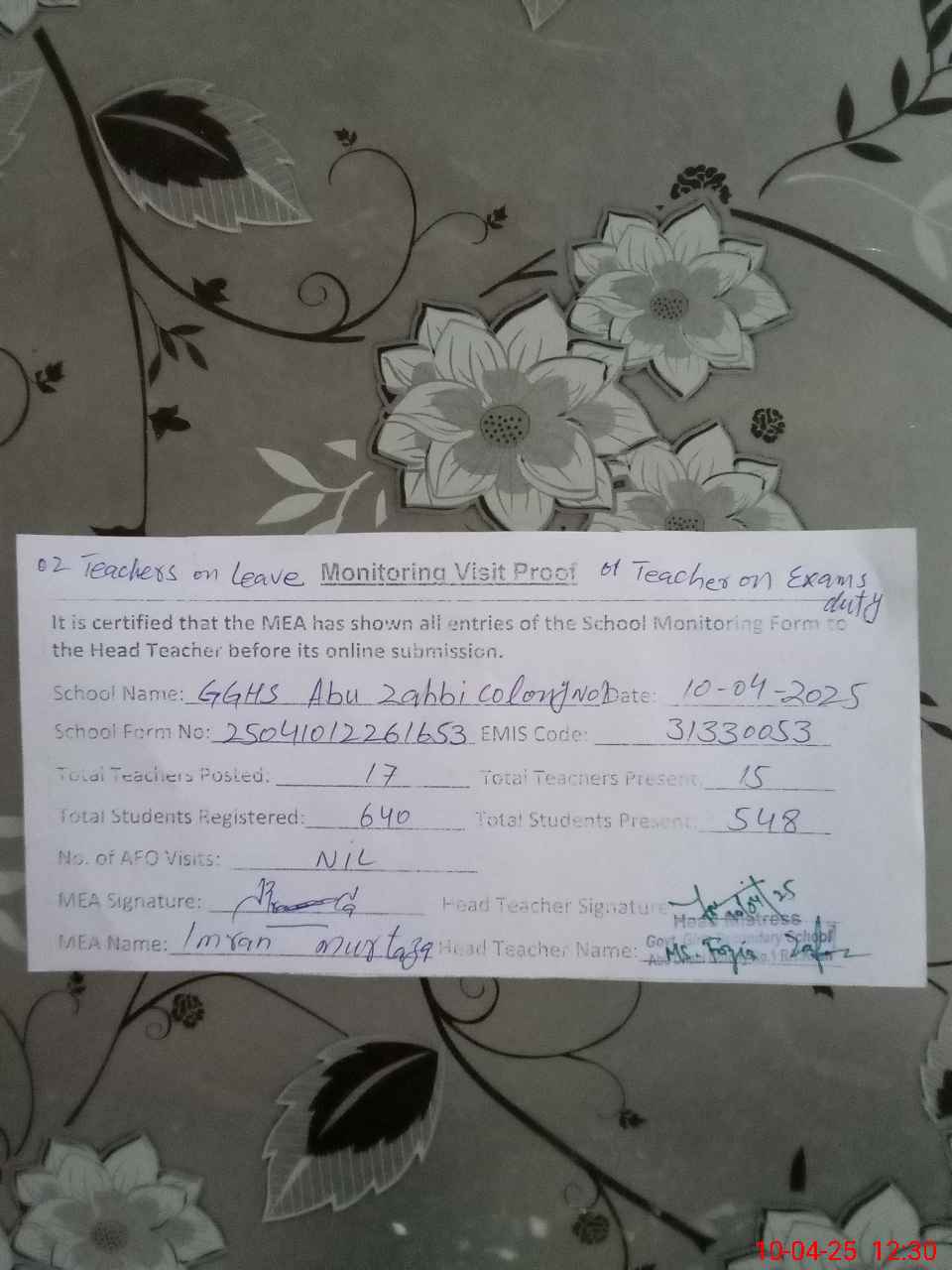 | Attendance Register | Head Teacher | MEA with School | Visit Proof |