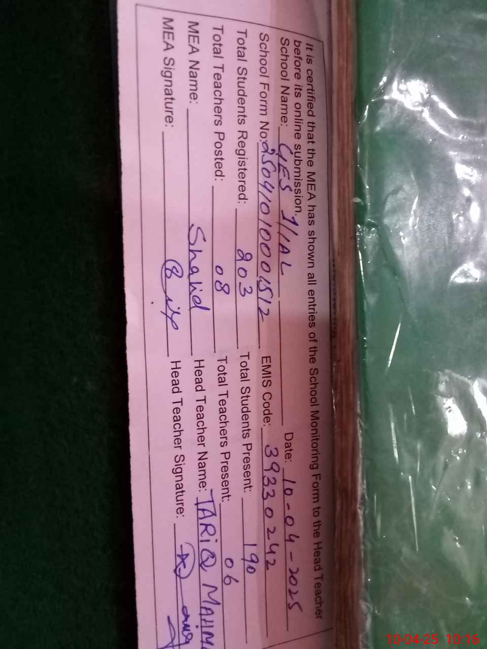 | Certified that this School was Inspected by the Undersigned MEA/DMO Today and the Information Stated Above is as Per Record. | |||||