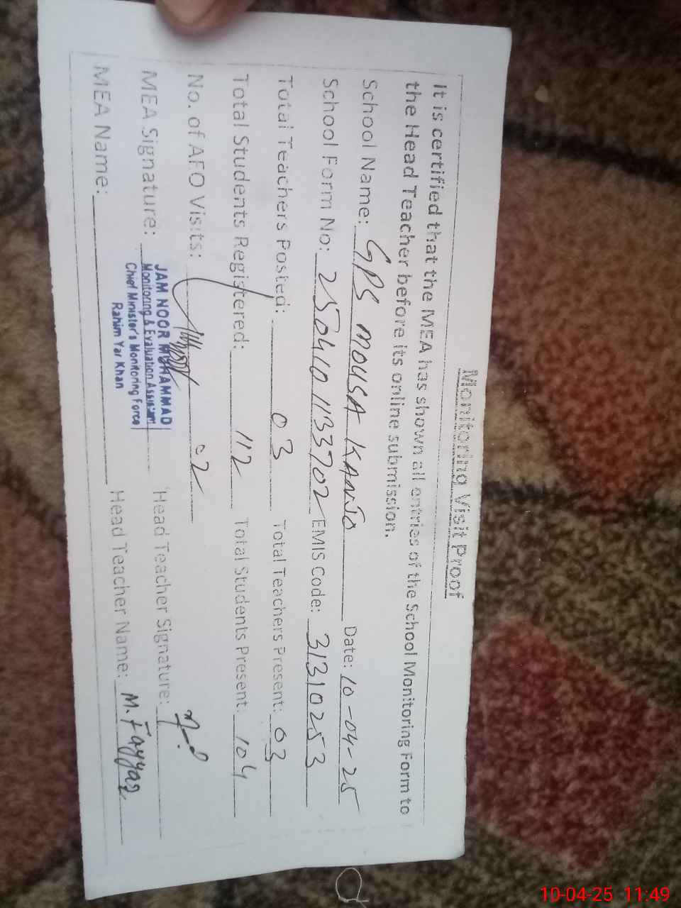| Certified that this School was Inspected by the Undersigned MEA/DMO Today and the Information Stated Above is as Per Record. | |||||