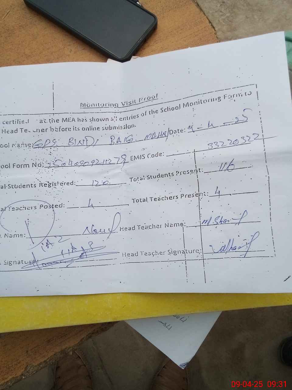 | EMIS Code: 33220322 | Name of School: GPS BINDI BAIG MAHNI | |||