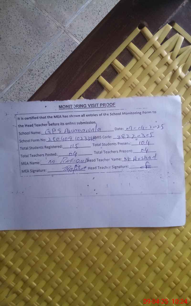 | EMIS Code: 38220305 | Name of School: GPS AWANA WALA (NEW SCHOOL) | |||