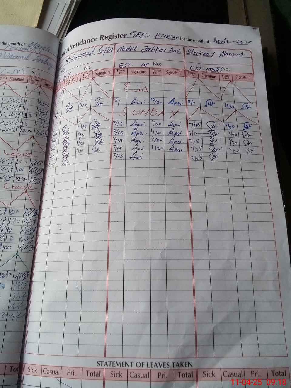 | CNIC | Full Name | Designation | R/C | Absence During Last Calender Month |