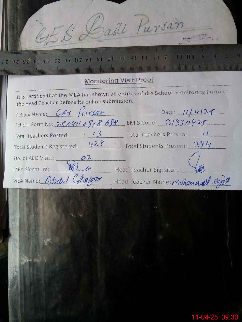 | Attendance Register | Head Teacher | MEA with School | Visit Proof |