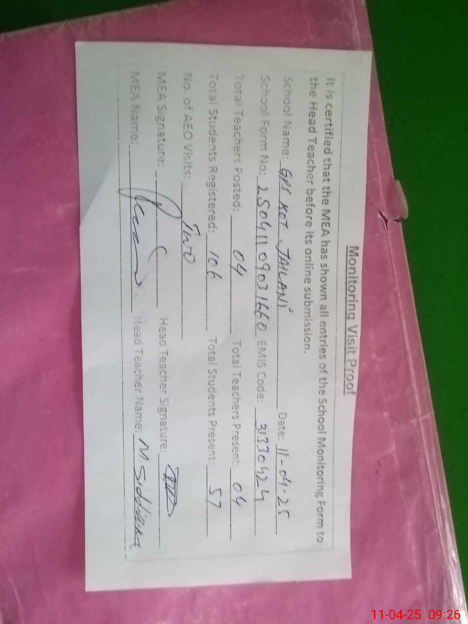 | Attendance Register | Head Teacher | MEA with School | Visit Proof |