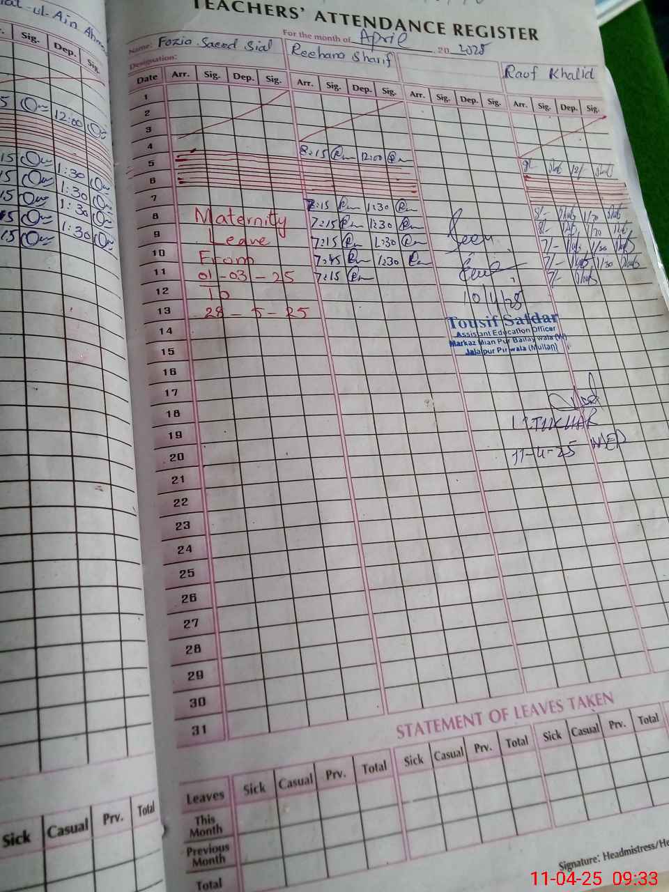 | Leave | Duty | Absent | Maternity | Medical | Ex- Pak |