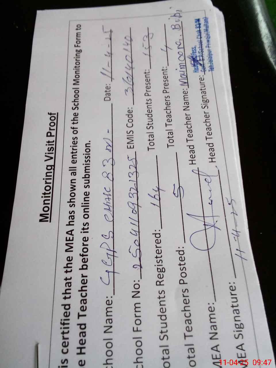 | Attendance Register | Head Teacher | MEA with School | Visit Proof |
