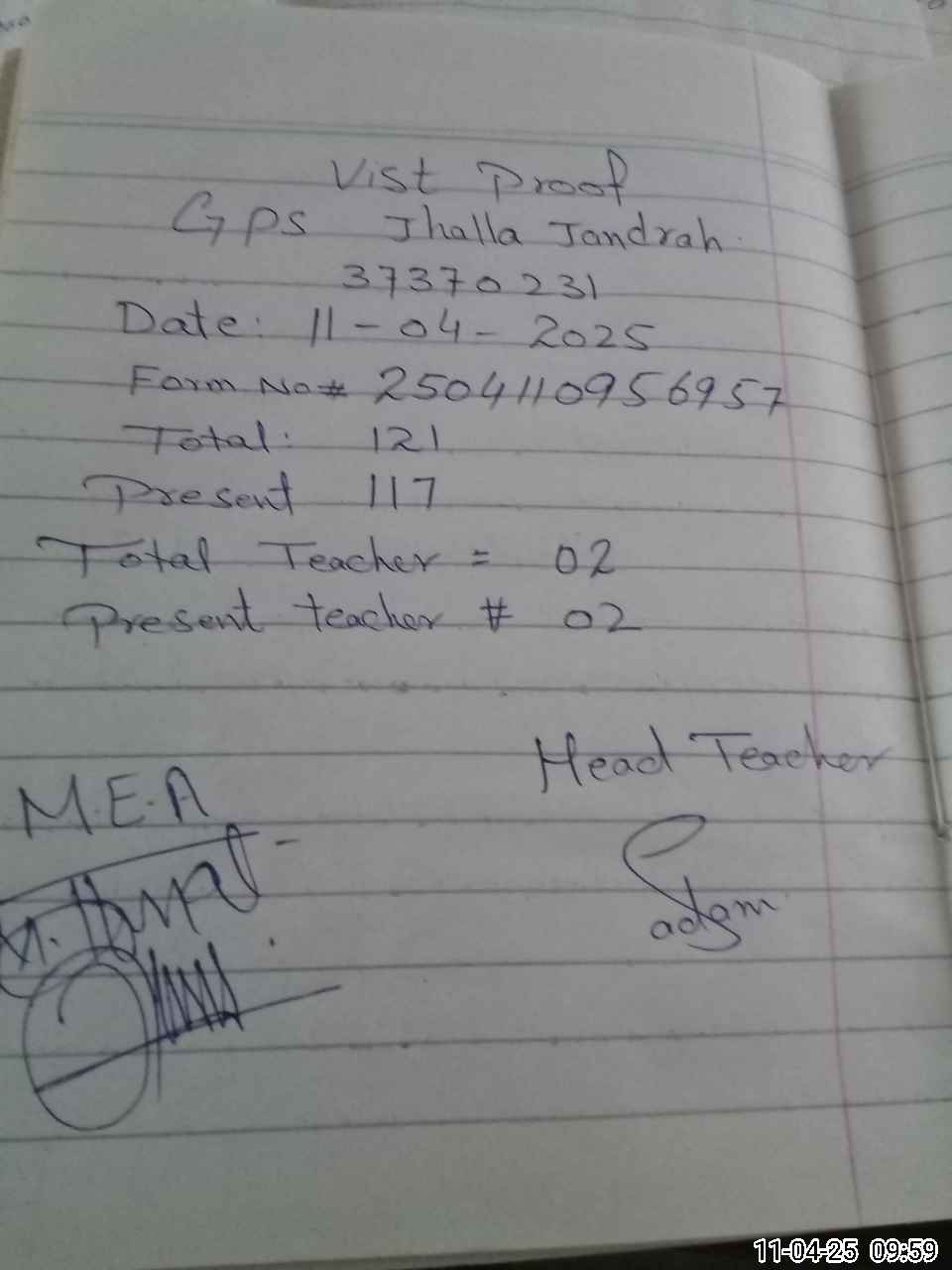 | Attendance Register | Head Teacher | MEA with School | Visit Proof |