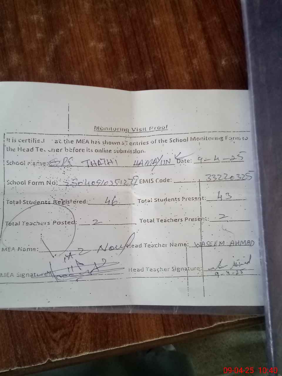| EMIS Code: 33220325 | Name of School: GPS THATHI HAMAYUN KI | |||