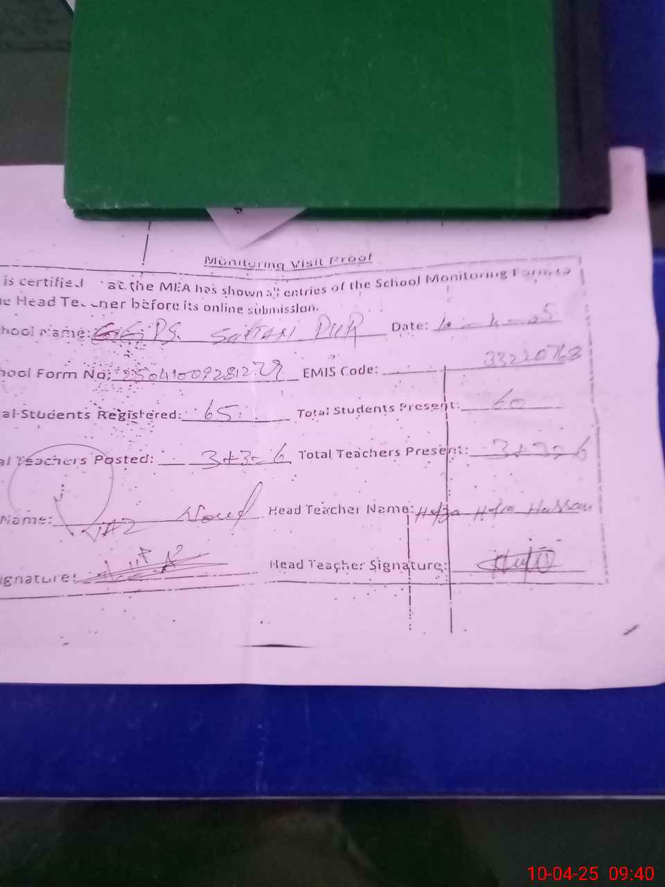 | Attendance Register | Head Teacher | MEA with School | Visit Proof |