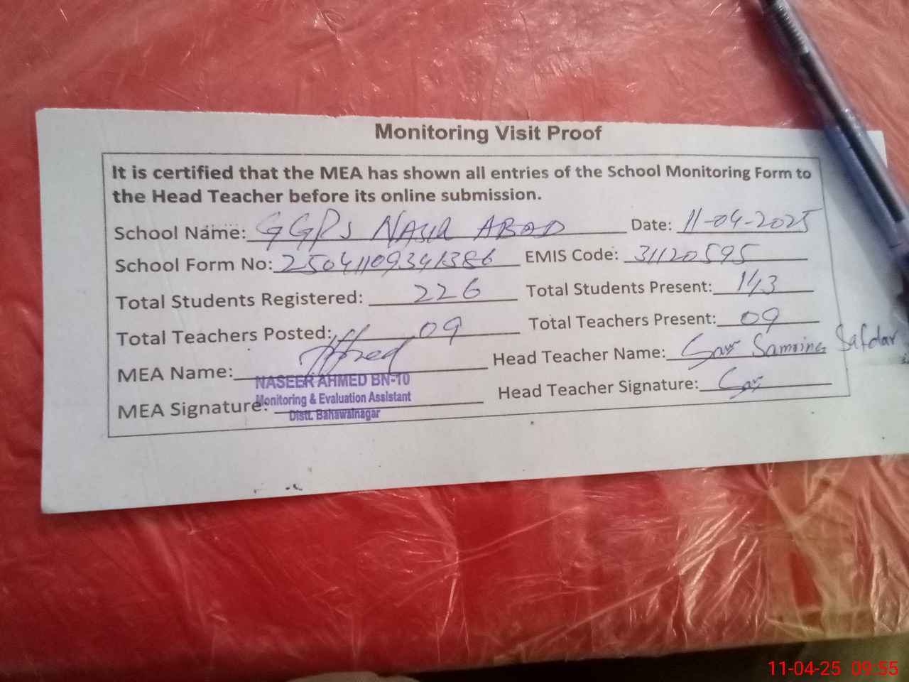 | Attendance Register | Head Teacher | MEA with School | Visit Proof |