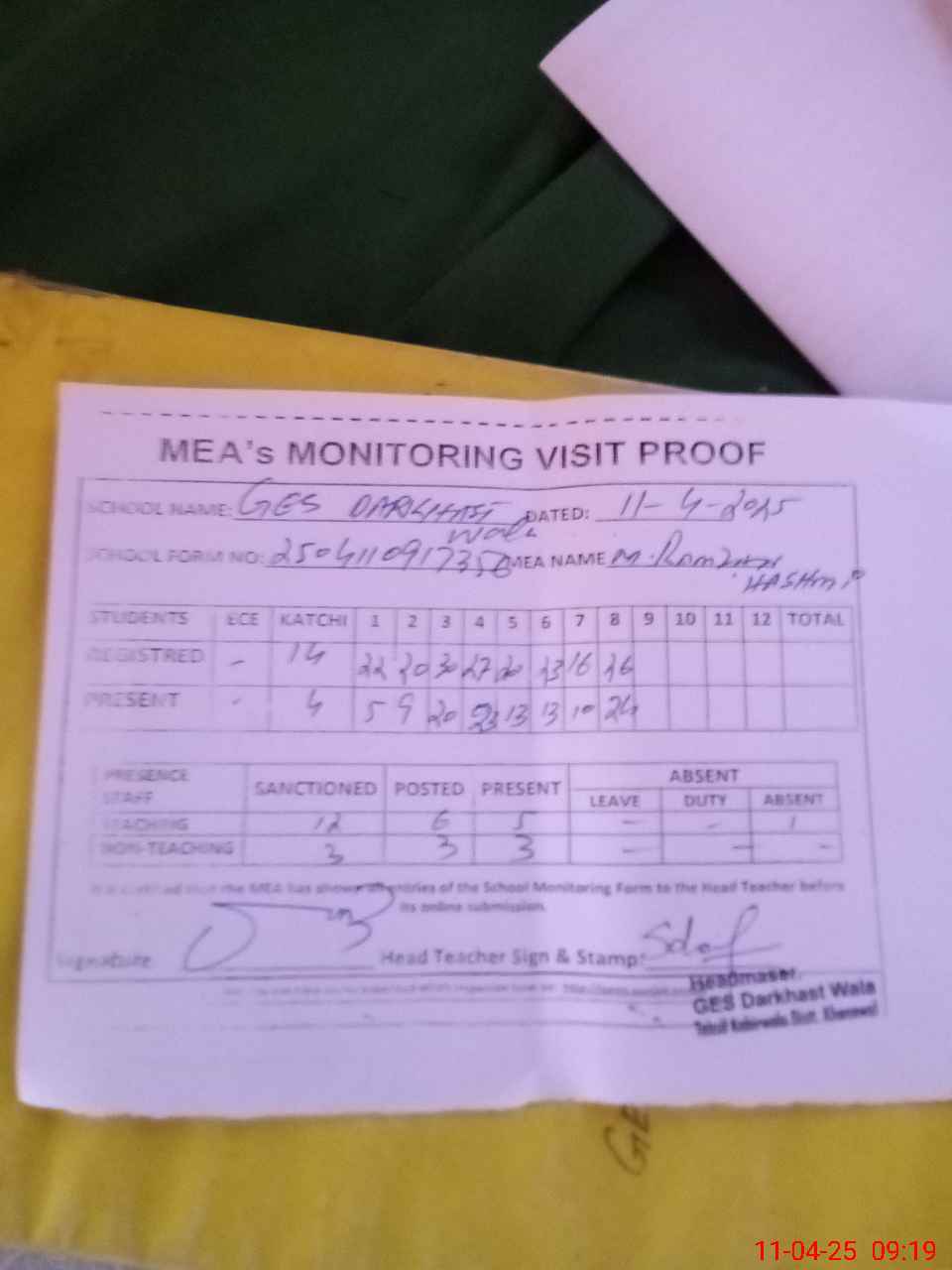 | Attendance Register | Head Teacher | MEA with School | Visit Proof |